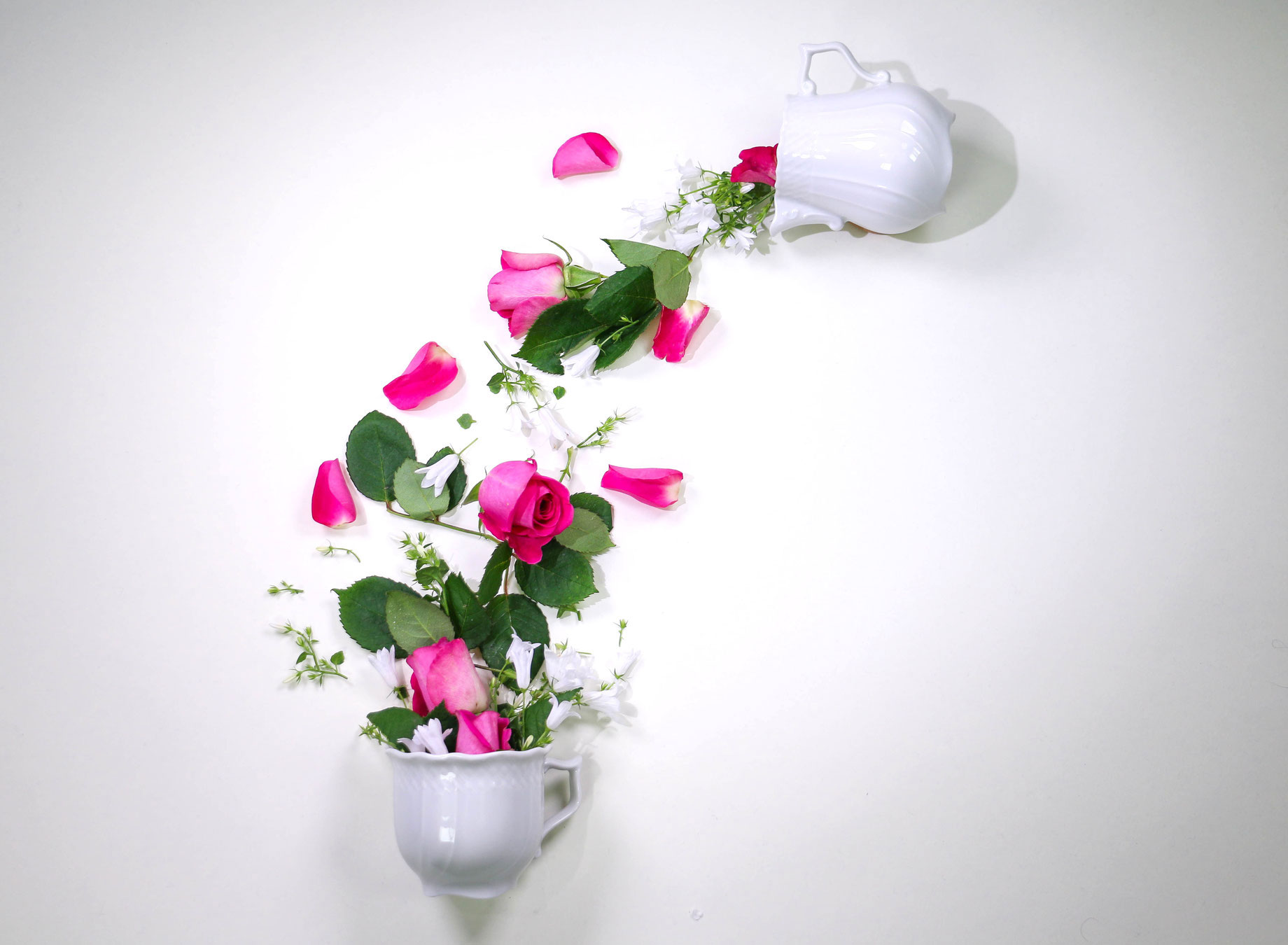 Mit viel und vor allem weichen Licht aus verschiedenen Seiten wurden die High Key Aufnahmen erzeugt, um möglichst niedrige Kontraste zu erhalten. Das Motiv hier besteht aus einer Komposition aus Rosen, weißen Glockenblumen, einer Tasse und Kanne aus weißem Porzellan.