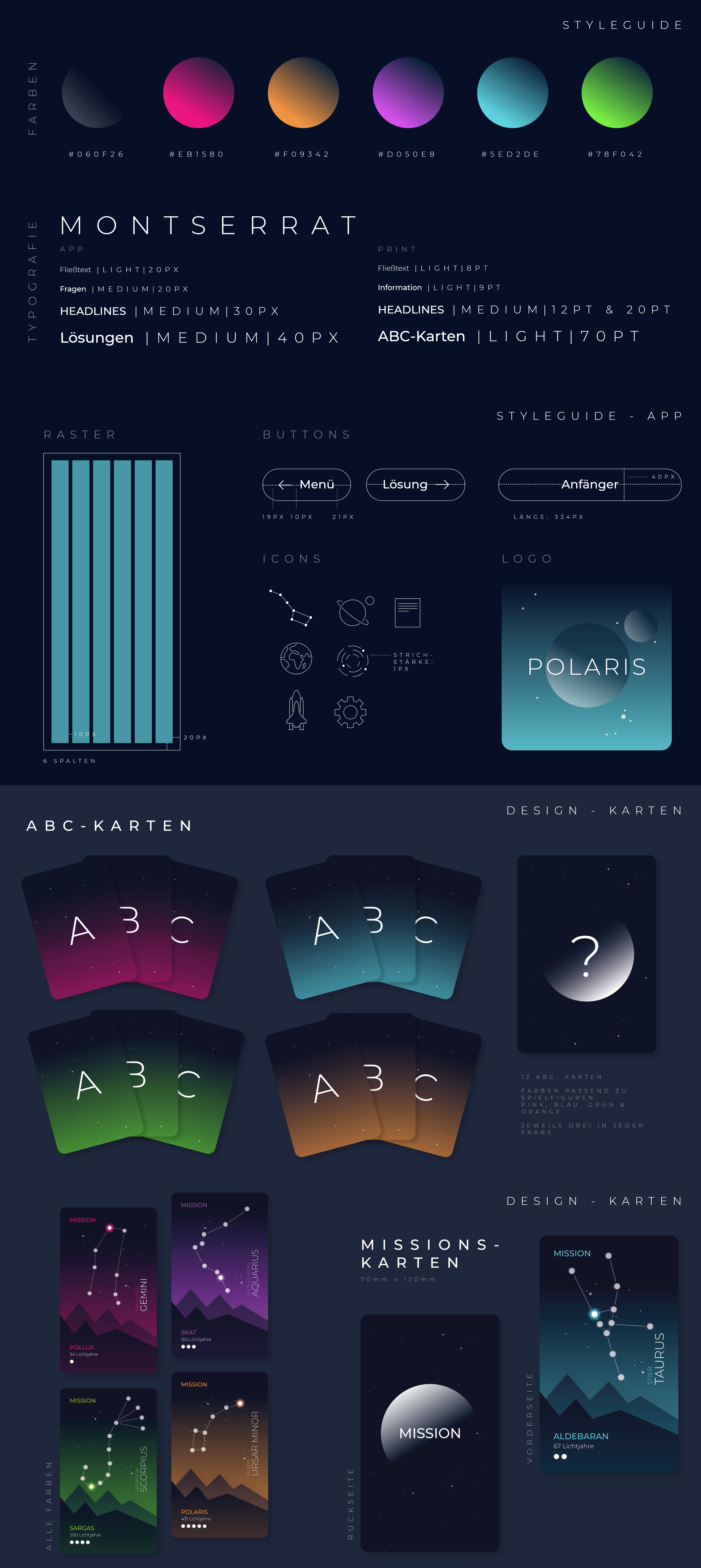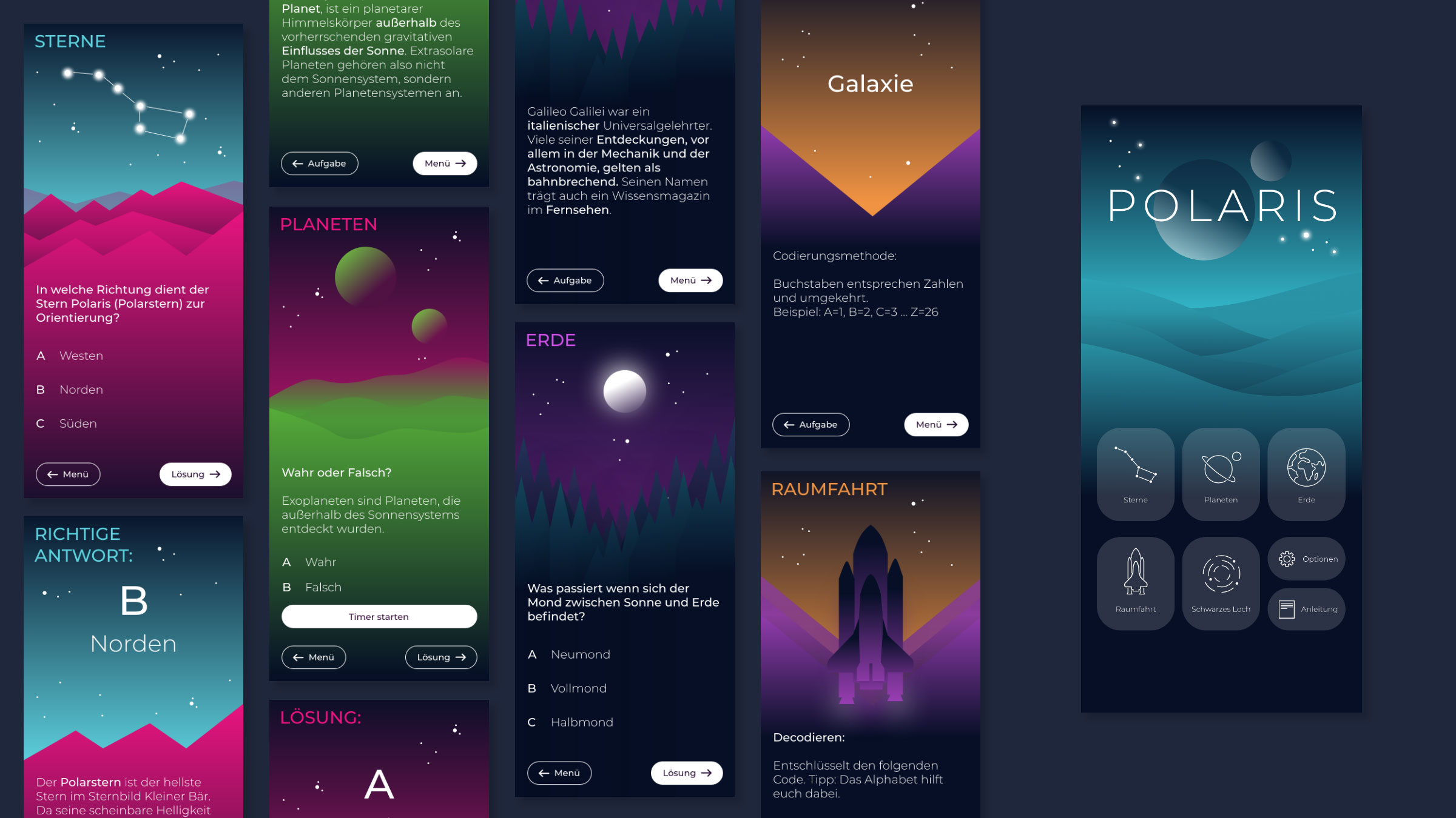 Polaris ist ein interaktives Brettspiel zum Thema „Astronomie“, das in Kombination mit einer mobilen Anwendung gespielt werden kann. Es soll Wissen über das Themengebiet Astronomie vermitteln und gleichzeitig einen Spaßfaktor garantieren. Das Projekt ist eine Kombination aus den Bereichen User Experience Design und Grafikdesign.