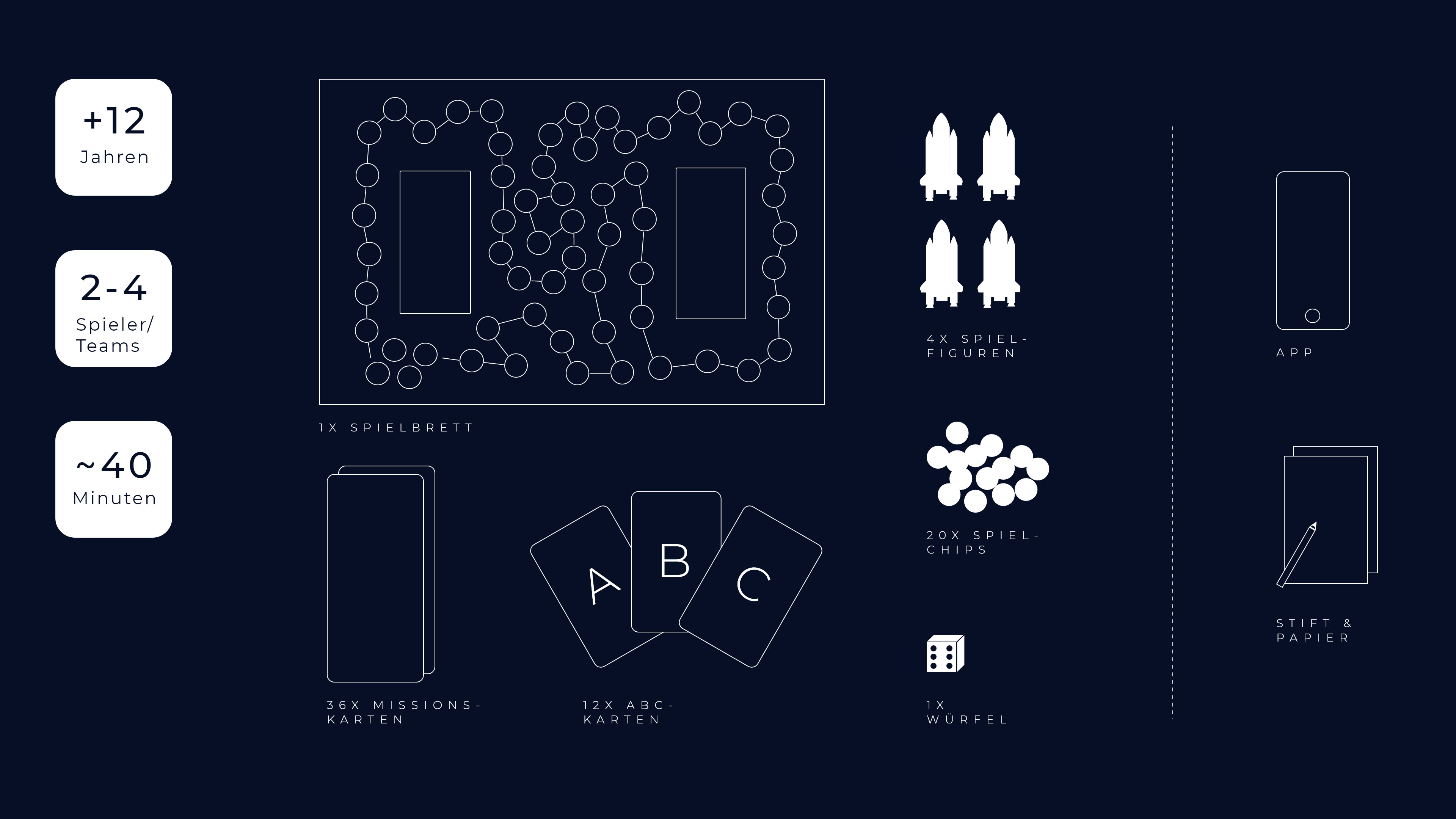 Die Spielfiguren stellen kleine Raumschiffe dar und wurden in 3D in Maya gemodelt. Danach wurden sie mit Hilfe eines 3D-Druckers erstellt und durch kleine Farbakzente optisch voneinander abgegrenzt. Die zwei verschiedenen Spielkartensätze wurden mit Adobe InDesign gestaltet und über eine Online-Druckerei erstellt. Das Spielfeld wurde mit Adobe Illustrator entworfen, als Aufkleber gedruckt und anschließend auf ein Blanko-Spielbrett geklebt. Das App-Konzept wurde mit Adobe XD umgesetzt und war so als Prototyp bereits spielbar.